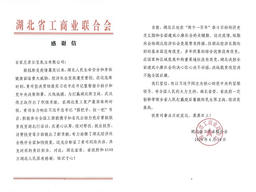 信中同时表示:湖北正处在“两个一百年”奋斗目标的历史交汇期和全面建成小康社会的关键期。疫情短期内为湖北经济社会发展带来阵痛,但湖北决胜全面建成小康社会的决心信心不动摇。君乐宝本次捐赠的暖心之举,有力助推了湖北经济社会秩序全面加快恢复,彰显了同舟共济、共克时艰的责任担当。对此,湖北省委、省政府和6100万湖北人民深表感谢,铭记于心。